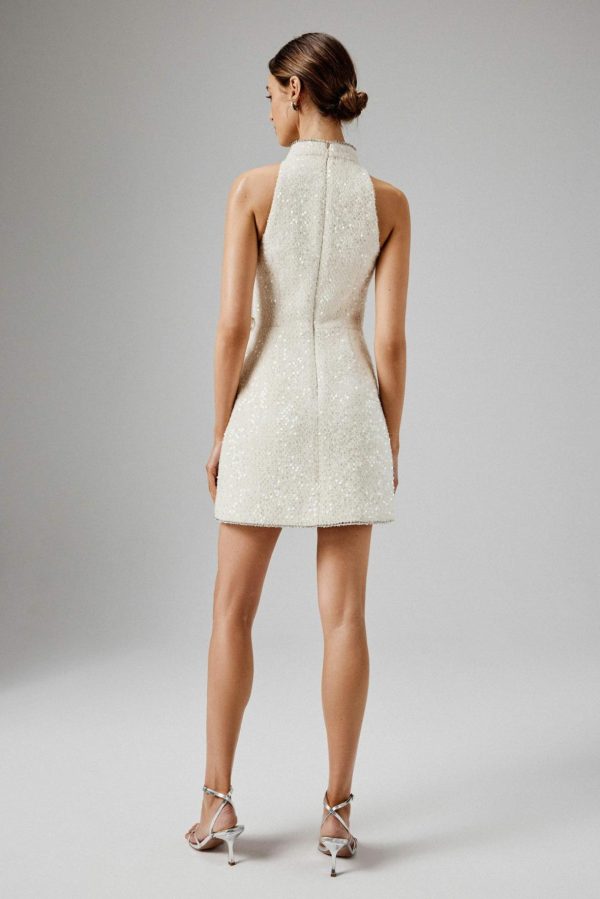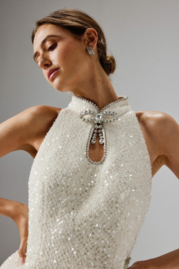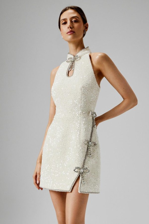 Bow Dresses | Women Lavish Alice SOLENE Sequin Boucle High Collar Mini Dress With Bow Embellishment In Beige I Dress With Bow Embellishment In