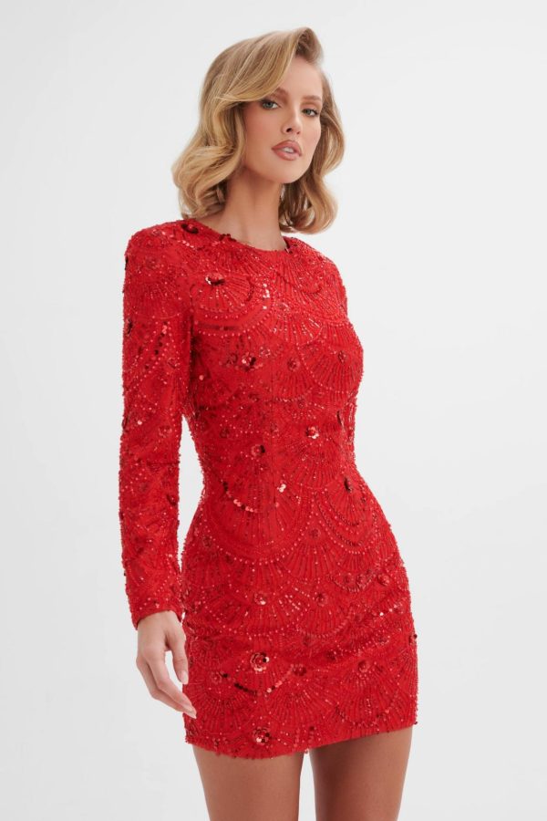 Unveil your inner glamour with the AURORA Embellished Mini Dress in Red. This luxurious mini dress features premium beaded embellishments in a striking red hue, and a close-to-body fit for a sculpted silhouette. With its long sleeves and intricate detailing, the AURORA dress is perfect for any glamorous occasion. Elevate your wardrobe with this stunning, head-turning piece.