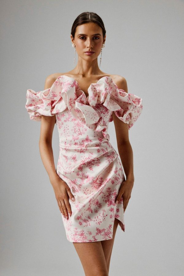 Off The Shoulder & Bardot | Women Lavish Alice CARRIE Bonded Satin Bardot Mini Dress In Pink Porcelain Print Pink Porcelain Print