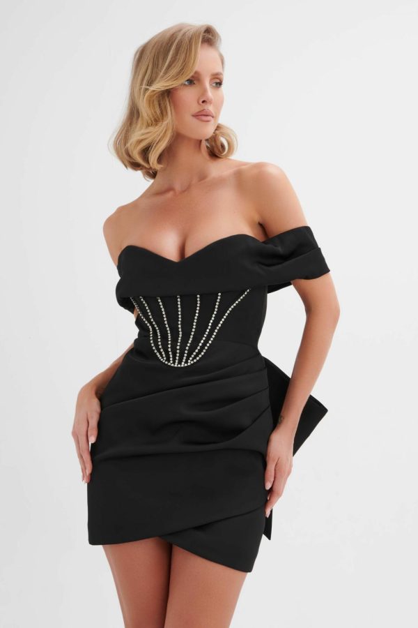 Expertly crafted from premium satin, our GEORGIE Satin Off Shoulder Lace Up Mini Dress in black boasts a flattering, close-to-body fit with an alluring off-shoulder design. The lace-up back and fixed bow detail add an elegant touch, while the deep pleat on the wrap skirt and corseted waist accentuate your shape. Perfect for special occasions and parties, this best-selling style is a must-have in classic black.