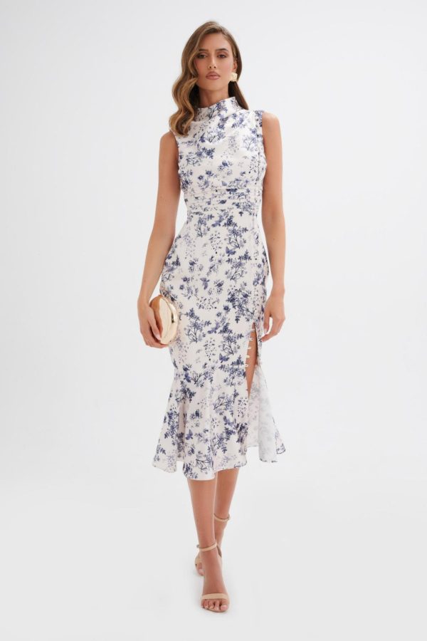 Wedding Guest | Women Lavish Alice SAFFRON High Neck Satin Midi Dress In Navy Porcelain Print Navy Porcelain Print